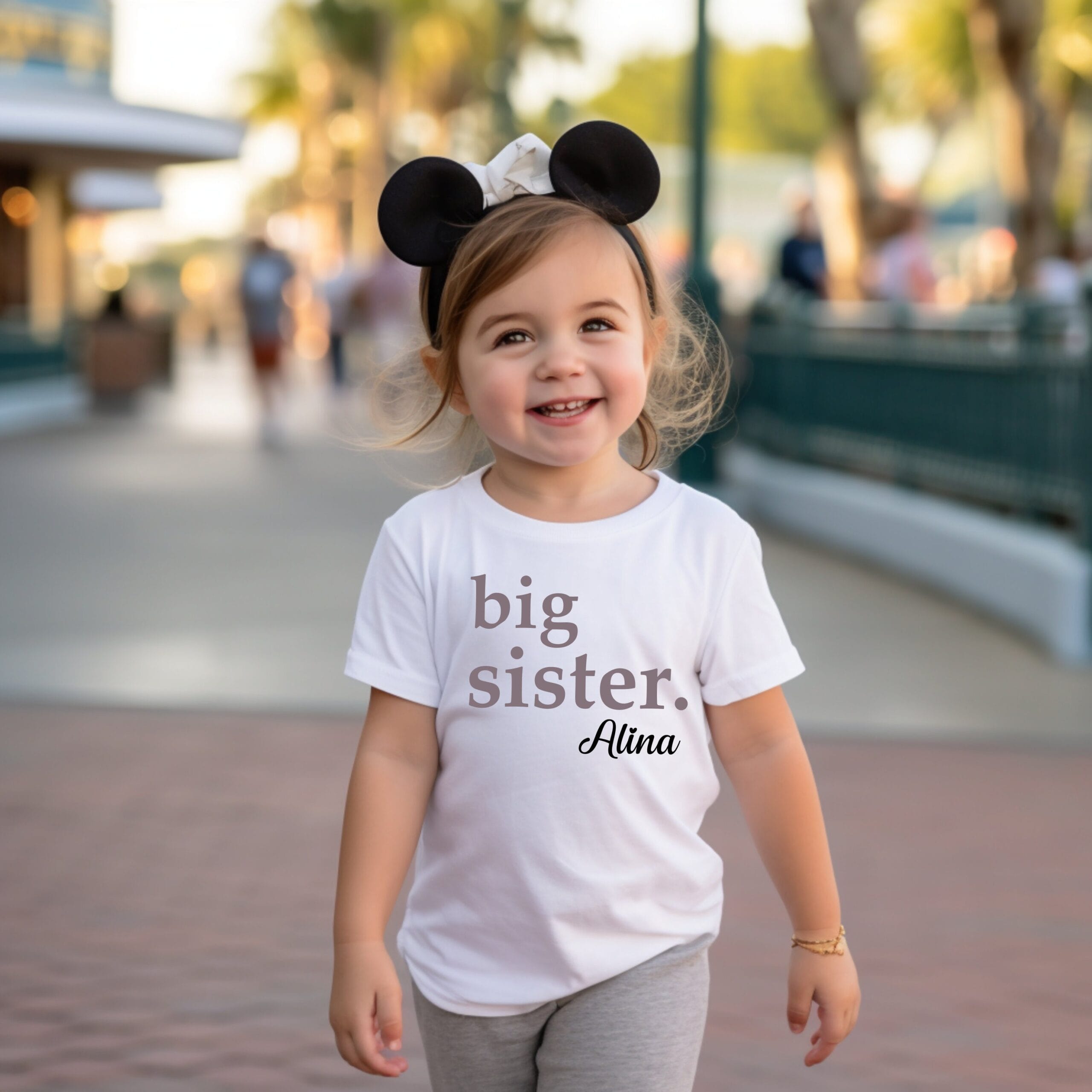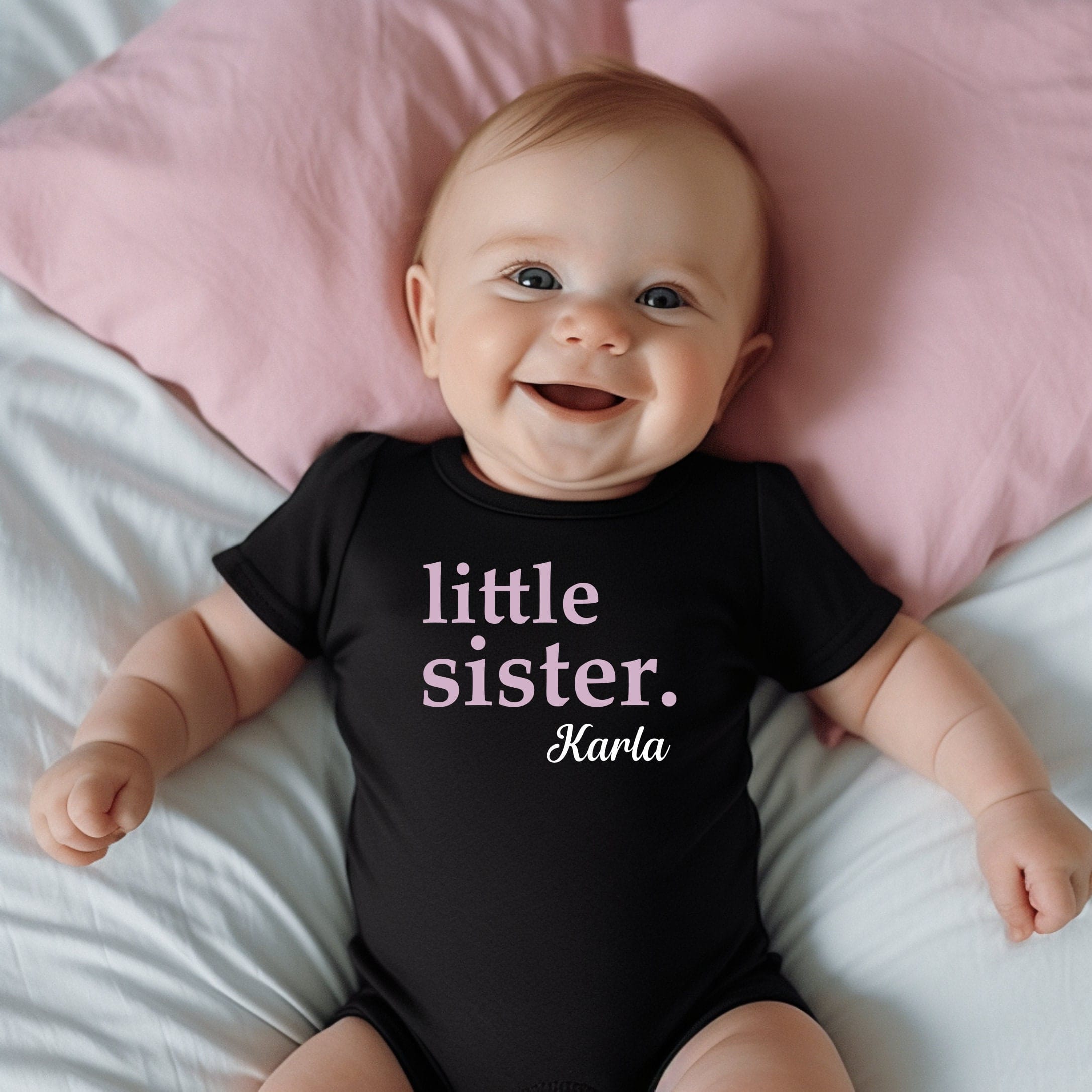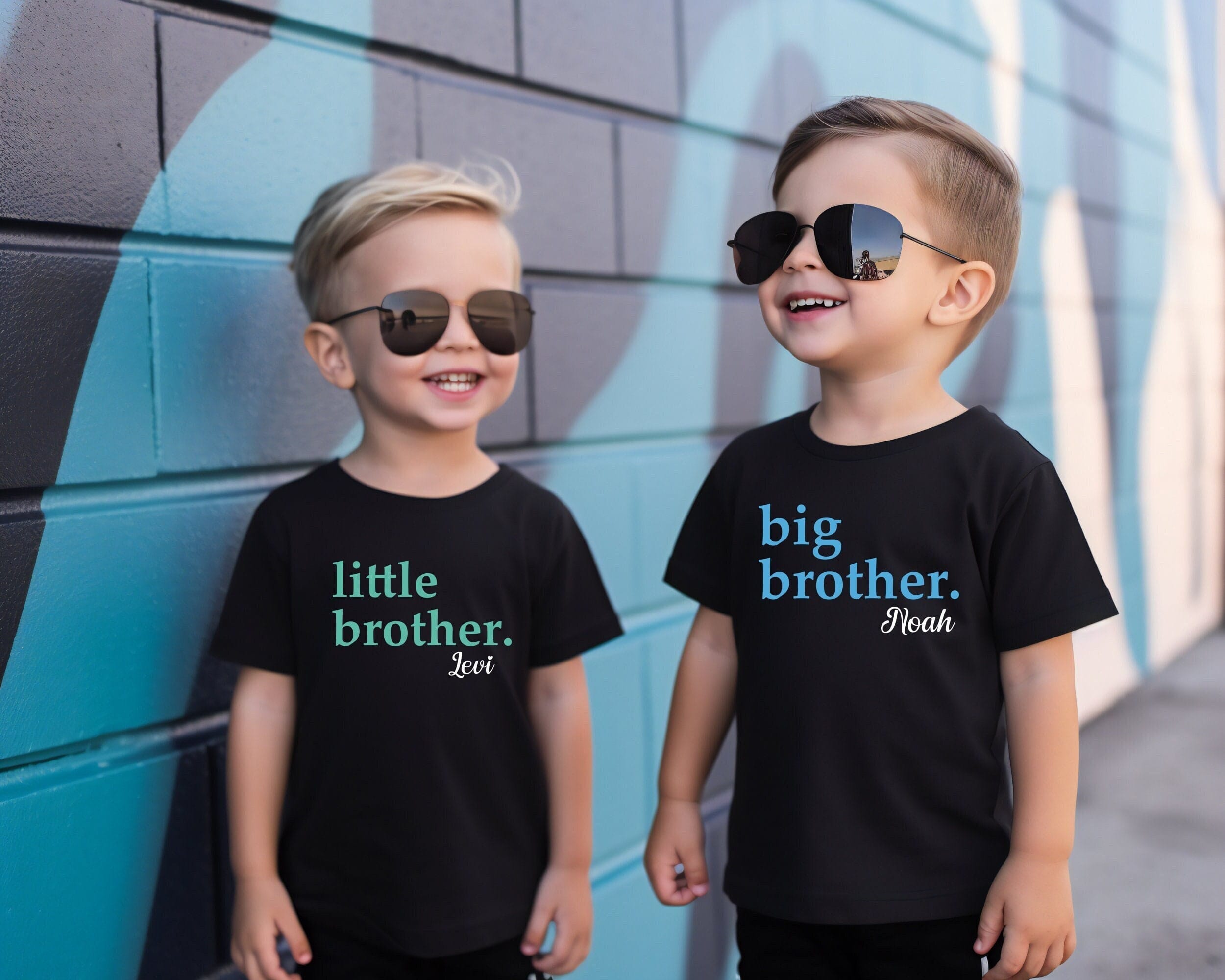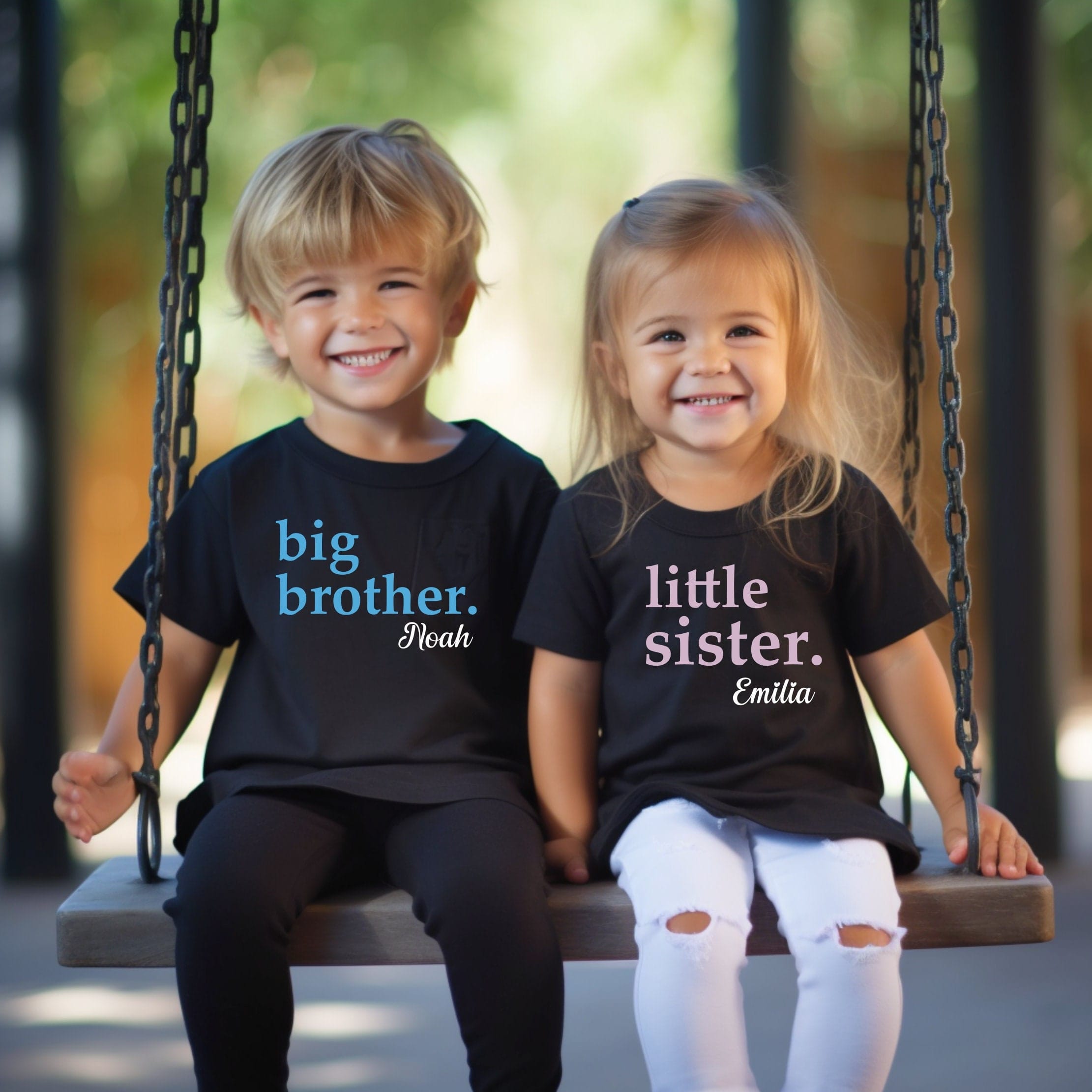 Mit Sorgfalt und Liebe zum Detail gefertigt, enthält jedes Set ein stilvolles Schwarz-Weiß-T-Shirt für den großen Bruder, den kleinen Bruder, die große Schwester oder die kleine Schwester, zusammen mit einem passenden Baby-Strampler oder T-Shirt. Was unsere Kollektion wirklich einzigartig macht, ist die Möglichkeit, den Namen Ihres Kindes hinzuzufügen, um ein einzigartiges Outfit zu schaffen, das ihre Individualität unterstreicht.